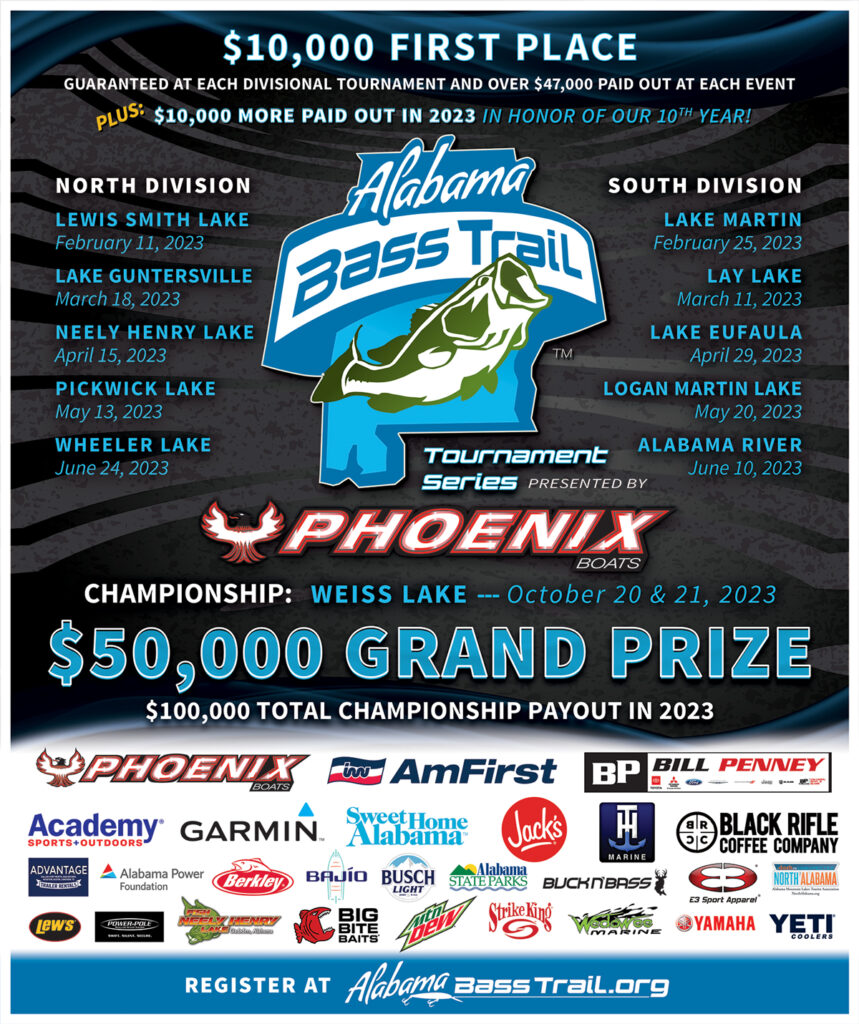 Decatur, Ala. (May 6, 2022) – The Alabama Bass Trail Tournament Series will enter its tenth season next year as the state’s premier weekend tournament trail for amateur bass anglers with an 11-event schedule offering more than $590,000 in awards including $10K in prize money in celebration of the tournament’s tenth anniversary. The season gets underway February 11, 2023, on Lewis Smith Lake and concludes Oct. 20-21, 2023, with the championship on Weiss Lake.