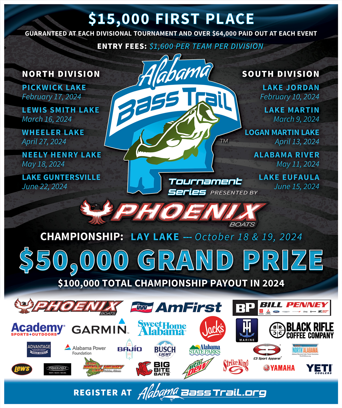 Alabama Bass Trail Tournament sponsors include Phoenix Bass Boats, Academy Sports + Outdoors, Advantage Trailer Rentals, Alabama Power Foundation, Alabama State Parks, Bajio Sunglasses, Big Bite Baits, Black Rifle Coffee Company, Busch Light, E3 Sport Apparel, Fish Neely Henry Lake, Jack’s, Lew’s Fishing, Mountain Dew, FishAlabama.org, Bill Penney Automotive, America’s First Federal Credit Union, Visit North Alabama, Alabama Tourism Department, T-H Marine Supplies, Inc., Power-Pole Total Boat Control, Strike King Lure Company, Yamaha, Yeti Coolers and Garmin.