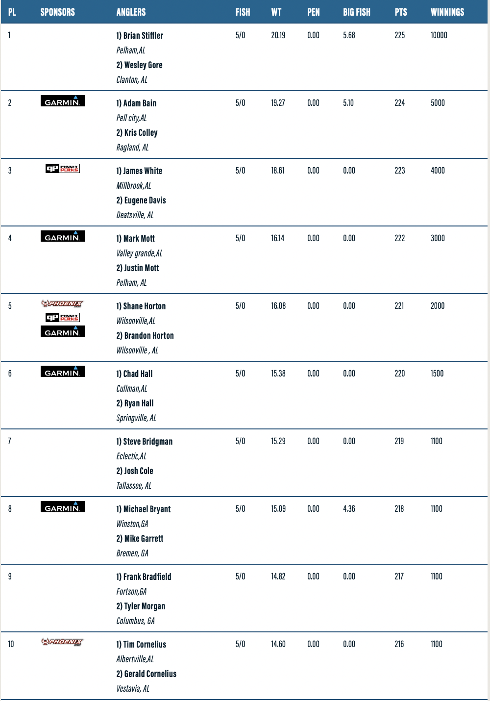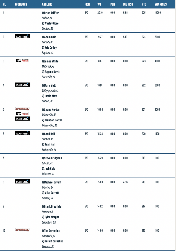 Brian Stiffler and Wesley Gore reeled in 20.19 pounds, a record weight in the ABT South Division for Alabama River, to claim first place and 10,000 plus bonuses and contingency money. The goal for them today was just to survive and collect some points. “Before this event we were doing well in the points, and we just wanted to keep adding to that. We had a good practice on Friday and found a spot that was holding some fish, so we hoped it would be there come tournament day.”