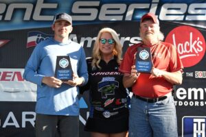 Today was a huge payday for them! They won in a brand new Phoenix Bass boat purchased from Wedowee Marine just over a week ago, so they added to their first prize winnings with bonuses from Phoenix and Wedowee. Last time they got a new boat, they won the next tournament, and the same thing happened today. They also purchased a truck from Bill Penny Toyota cashing a Toyota bonus check for that as well. Today’s winnings including bonuses total $18,500.