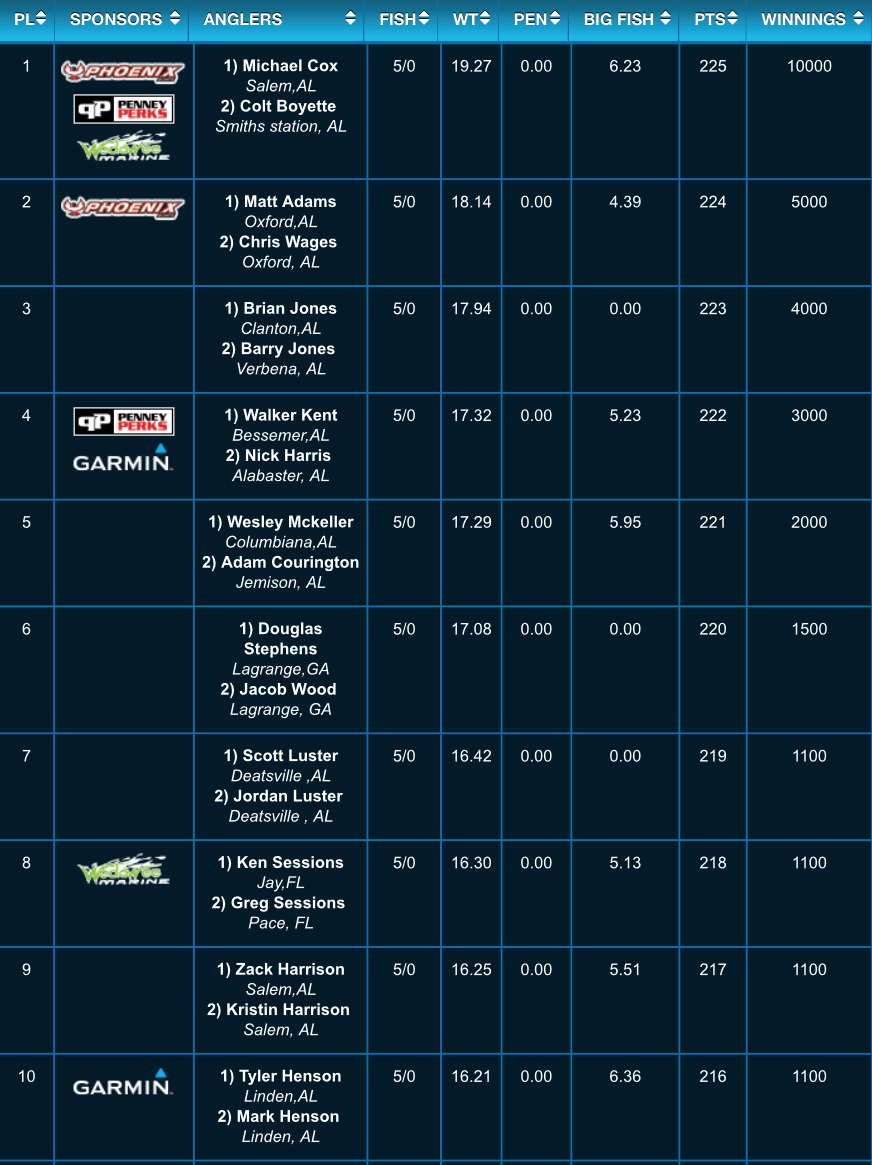 Top ten standings are below for a complete list see: https://dev-alabama-bass-trail.pantheon.io/tournament-series/wl-results/