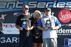 The third place team of Brandon Jones and Barry Jones decided to fish today without any practice. Brandon said “we just haven’t had any time to practice and although this is what we consider to be their home lake, we still feel this lake is a hard place to do well.” They planned to come today and just go fishing. He said, “we hoped we could scratch out a limit, keep some points and move on to the next event.” They knew a few places to go and a spot where the fish push shad up early in the morning. Barry said, “while waiting for take-off this morning, I decided to tie on a Pop-R and see if they would hit it today.” On that first spot with the first cast one blew up on it, but he missed it. They continued to work the area getting more and more bites. Eventually, they worked back through the area a second time and caught two fish on back to back cast. Within 2.5 hours they had a limit “just fishing.” Their key baits were a Spro Poppin Frog, a Berkley Chopo, and a Stanley Ribbit Buzz Frog- all in white. All their fish came in 2 feet of water or less. They said they were a little surprised at the third place finish especially since they didn’t have any time to practice. Today they just went fishing and caught 17.94- good enough for 3rd place and $4000.