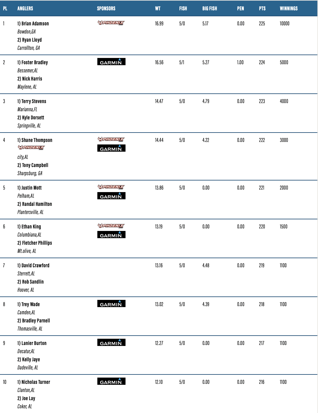 The team of Brian Adamson and Ryan Lloyd started this event in 12th place in the AOY standings. They knew they had some work to do if they wanted to make the Top 9 and fish in the BASS Team Championship. “We made a long run this morning, and Brian caught a big one first thing giving us a small limit early. We kept our heads down and fished hard getting the other two big bites to seal the deal about 1:00.” They weighed in 16.99 pounds including a 5.17 kicker and enough for the win. “The plan for us was just to survive; we wanted to fish to win, but we really wanted to make the top 9. We started out early this morning fishing a topwater frog shallow in 0 to 1 foot of water. We soon realized we were going to have to make an adjustment. We changed it up and flipped a Z Craw and focused on the less obvious stuff and places nobody else was fishing. We fished around isolated wood mainly along the river channel. We were fortunate to get those two bites late in the day that really made the difference for us. With this win they collected a $10,000 payday plus the $2,500 Phoenix Pay Day Bonus and $500 Garmin Bonus. Along with the win that automatically qualifies them for the ABT Championship, they also moved into 6th place in AOY standing and qualified for the BASS Team Championship.