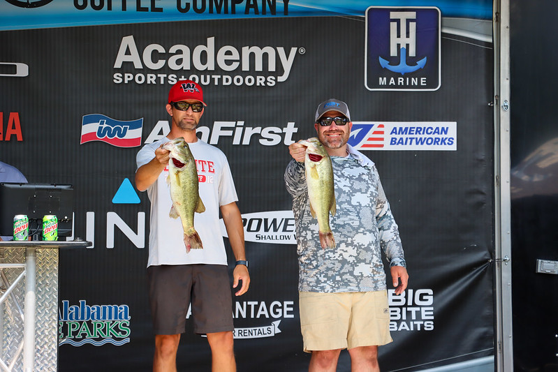 The team of Foster “Chip” Bradley and Nick Harris finished in second place with 16.56 pounds and a 5.27 kicker. “Practice was a little spotty for us; we located some areas that were holding fish, but we didn’t know they were five pounders until today. Today, we made the long run down river to where we practiced because we are just more comfortable on that end of the lake. It is a risk when you make the run down there because of all the boat traffic messing up the water, but because we have already qualified for the Team Championship and we missed the Eufaula tournament, we felt we had nothing to lose. We had one other area close where we could have caught 13-14 pounds, but we decided to make the run and take the risk. We stayed on the river for the first 2 hours swimming a White Davis jig around grass mats- the same jig we won the Logan Martin tournament on. We fished it around isolated grass mats that were hung up in the trees along the bank. We hit a bunch of little grass spots along the main river expecting to catch more fish in the three-pound range, but we were excited to catch some over 5 pounds. After 9:00, the bite just got tough. We caught around 15 throughout the day.” The heartbreaker for them was they had a dead fish penalty that cost them the win. This is the second time this has happened to them. It is difficult to win these events, and everything has to go perfect for a win. They “checked the fish before they headed back, and it was fine; it just didn’t make it in the end.” With their second-place finish they collected a $5,000 payday plus a $2,000 AmFirst highest finisher bonus.