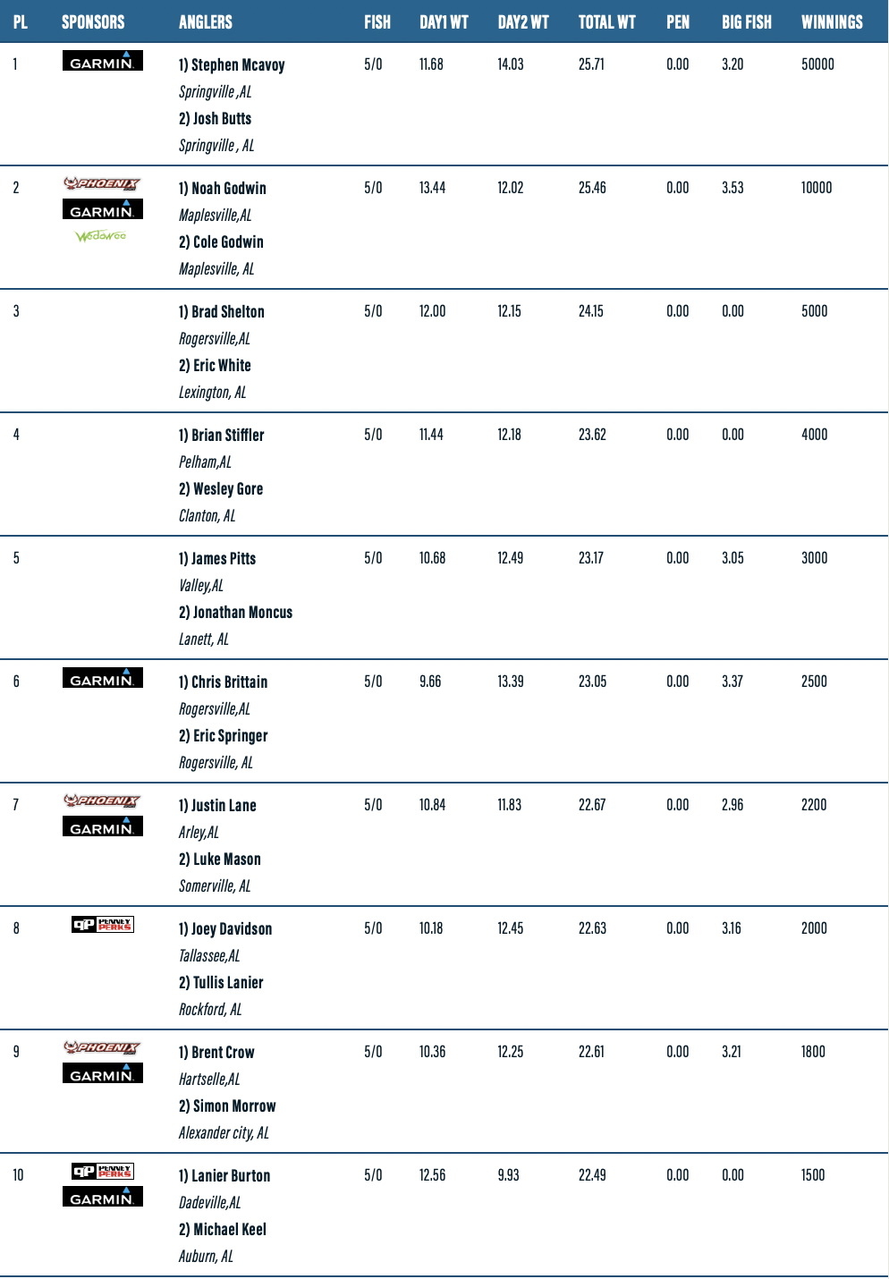 Garmin, Jack’s, Lew’s, Mtn Dew, Alabama Mountain Lakes Tourist Association, Power-