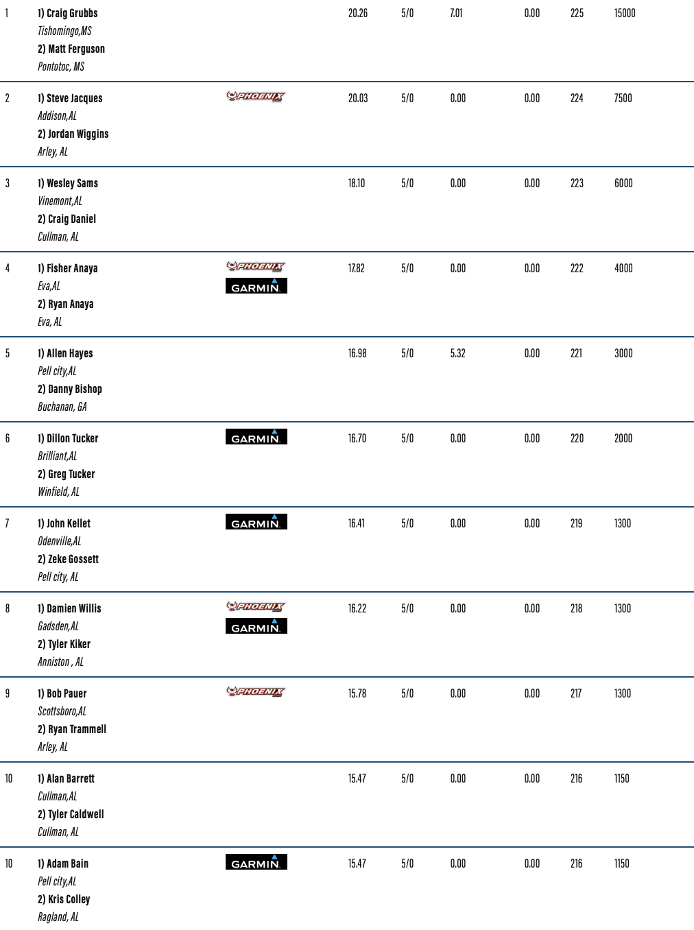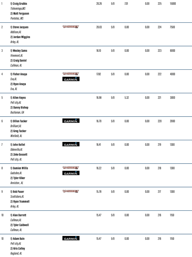 The top ten standings are below for a complete list of standings please visit: https://dev-alabama-bass-trail.pantheon.io/lewis-smith-lake/results/