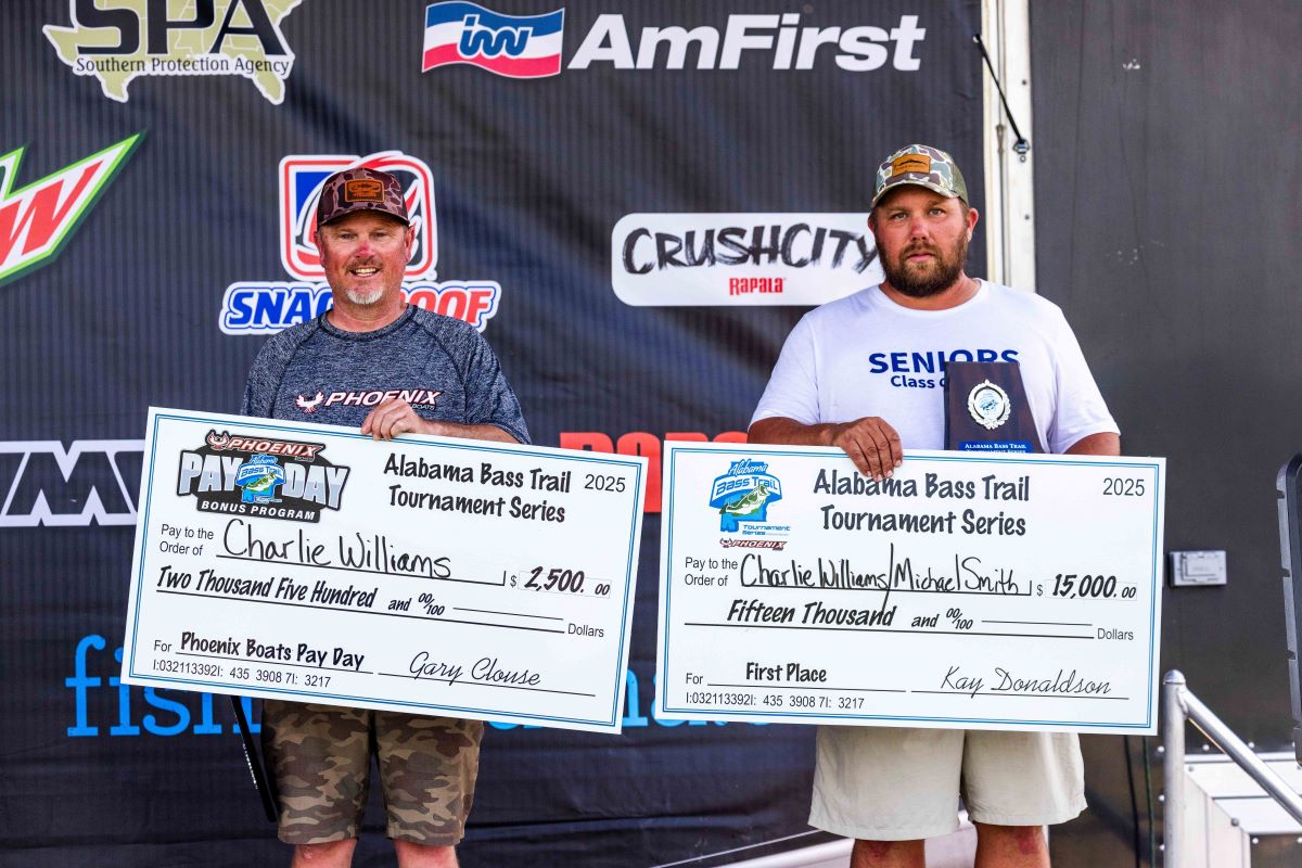 Charlie Williams and Michal Smith are familiar faces in the ABT winners’ circle. They previously won over $57,000 at Lake Martin during the ABT Championship in 2020, noting that winning that event felt like winning five of these competitions. However, since then, they have kept a lower profile due to the intense competition in these events, making it difficult to secure another win. One of their key baits was a homemade Hair Jig, which helped them catch one of their larger fish. They reported fishing in water depths of 10-13 feet and used Garmin LiveScope to target these fish, although getting them to bite proved to be a challenge. The other fish they weighed in came from using a Crush City Freeloader paired with a VMC Jig Head. Early on, they caught numerous 3-pound fish with a football jig and a Zoom Z Craw Jr. as a trailer. The team emphasized that they really had to present the bait right in front of the fish to entice them to bite. They expressed their gratitude for being back on the ABT stage and proudly holding their trophies once more, celebrating a substantial payday of $17,500, which included the Phoenix Bonus Money.