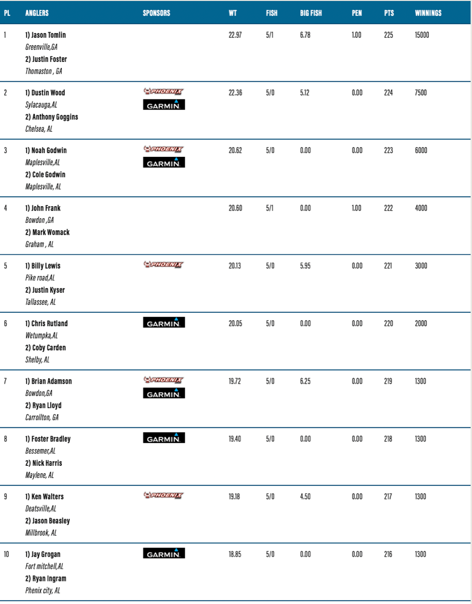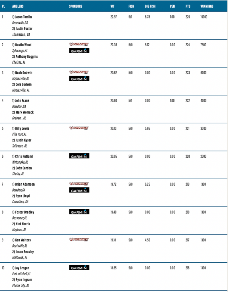Tomlin and Foster win ABT Lake Eufaula with 22.97
