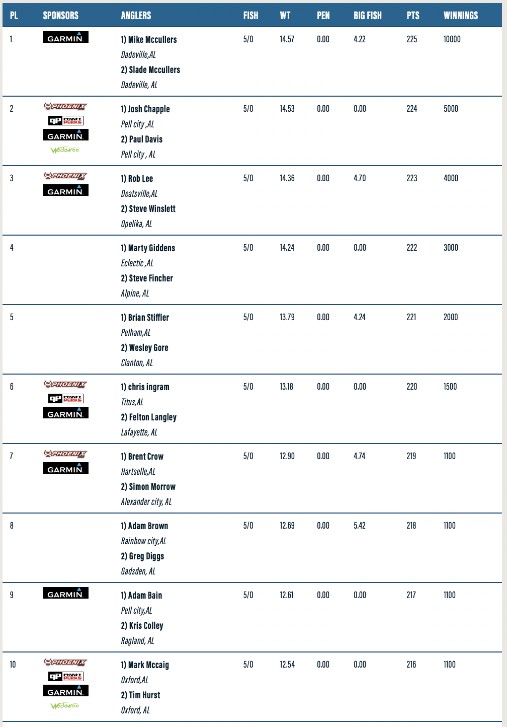 The Top 10 places are below for a complete list of standings visit: https://dev-alabama-bass-trail.pantheon.io/lake-martin/results/