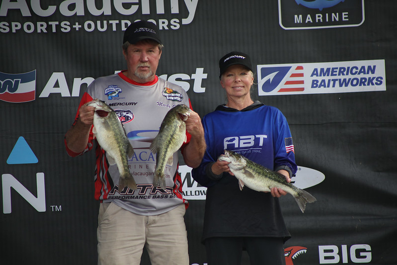 The team of Marty Giddens and Kim Giddens finished second with 19.05 lbs. The husband and wife team practiced a few days earlier in the week and developed a pattern on Thursday that they felt would get better by the time they blasted off on tournament morning. According to Marty, “we pulled up in the morning and I caught a four pounder in the first five minutes. By 8:30 am we had close to 15 lbs.” Kim stated, “the most amazing thing was culling three pounders”. Their limit at the end of the day was all spotted bass. Their pattern consisted of fishing anywhere from the bank to about ten feet of water. They figured these fish were pulling up to start the spawning process. The majority of their fish were caught on 1/8 oz. Davis Baits Shakey Head Jigs tipped with Alabama Craw and Chartreuse Finesse Worms. A few fish were caught later in the day on a Gizzard Shad colored 5” Big Bite Baits swimbait.