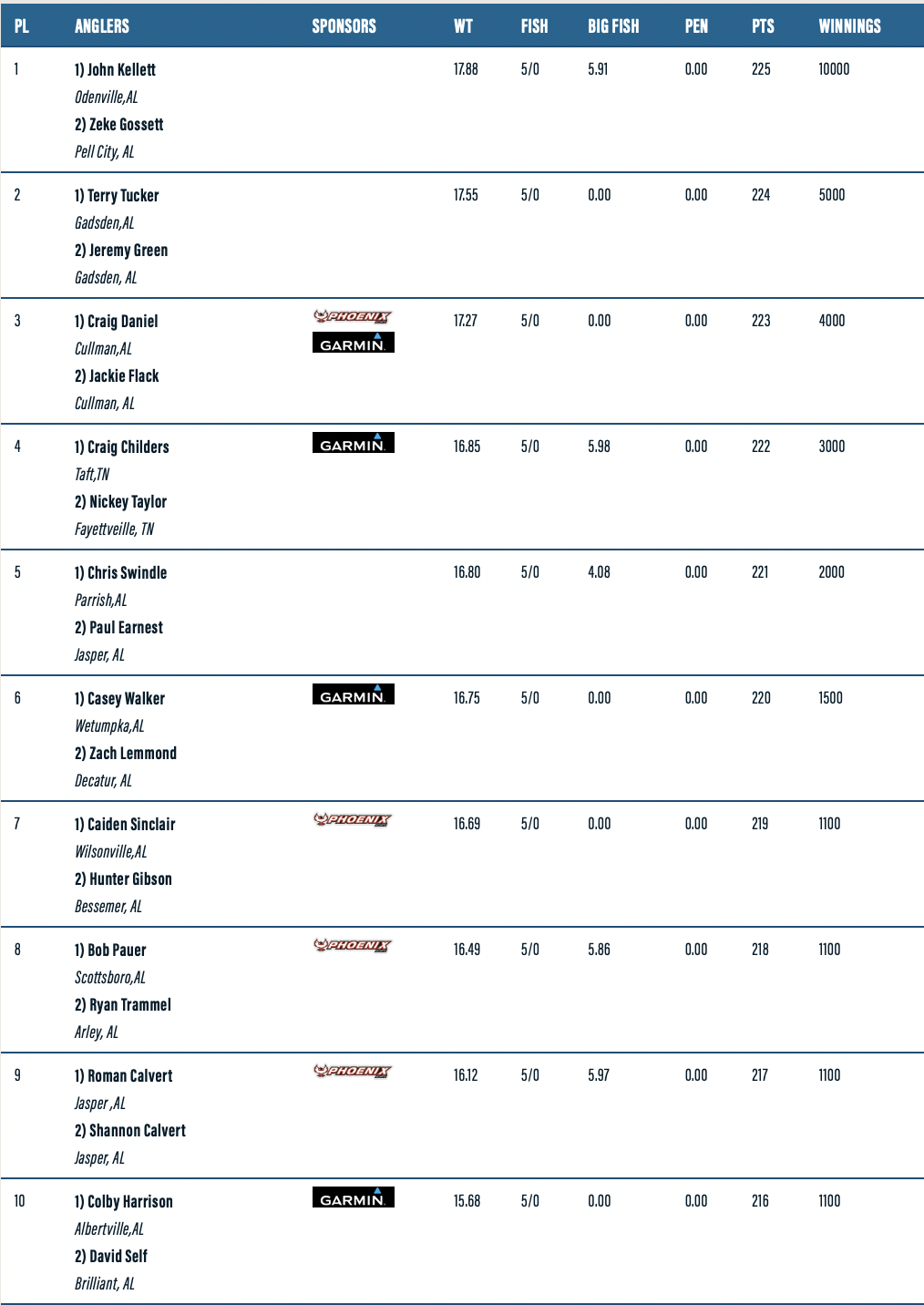 Craig Daniel and Jackie Flack are no strangers to the Smith Lake Leader board. They have had much success on this lake throughout their many years of fishing it. They weighed in 17.27 pounds- enough for third-place in this event and a $4000 check plus the $2,500 Phoenix Boats Pay Day and the $500 Garmin highest finisher for a total of $7000 including bonuses. “Depth and color mean a lot here and finding the right conditions are key at Smith Lake. The temps changed a lot, but the water temp didn’t fluctuate much so we felt the fish would be doing some of the same things today. We started out in a ditch in about 25 feet of water and caught three out of it. We moved to another ditch and caught three more, moved once again and caught about 10. We pulled the trolling motor about 100 times today fishing lots of water. We figured out we needed to focus on smaller ditches instead of big ditches. The jig bite was better today and that surprised us. The fish were tight to the bottom. You can catch one and see on the Garmin Live Scope about 10 come off the bottom with it. We caught them on a homemade jig in green pumpkin. The key to the jig was a heavy weed guard that kept it from getting hung up in the wooded areas where we were fishing.”