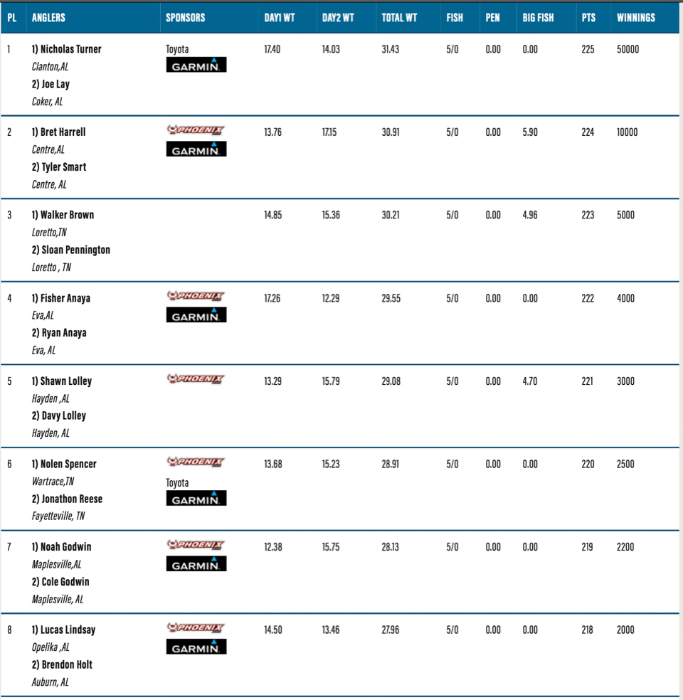 The Top 8 places are below. For a complete list of standings, visit: https://dev-alabama-bass-trail.pantheon.io/lay-lake/results/