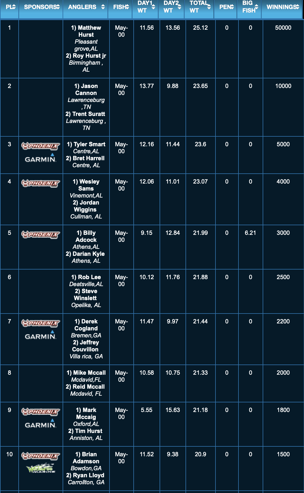 Day one top ten leaders were held back to weigh last on day 2 leaving #TeamHurst as the last team to weigh in before the leaders came across the stage. After they weighed-in they were seated in the Phoenix Boats hot seat while the other teams crossed the stage with the hopes to knock them off the hot seat. As team after team continued to fall short, #TeamHurst began to feel the reality sink in. When the final team to weigh-in was unsuccessful at beating their total #TeamHurst was all smiles expressing thankfulness for their family support and how honored they were to have done so well against such a great field of anglers. This was the first year for #TeamHurst to fish the ABT, and they took home over $50,200 in cash and bonuses and the title of ABT 2021 Champs. They said the key to winning this event was “consistency.” They were the only team that was able to have a good weight on both days.