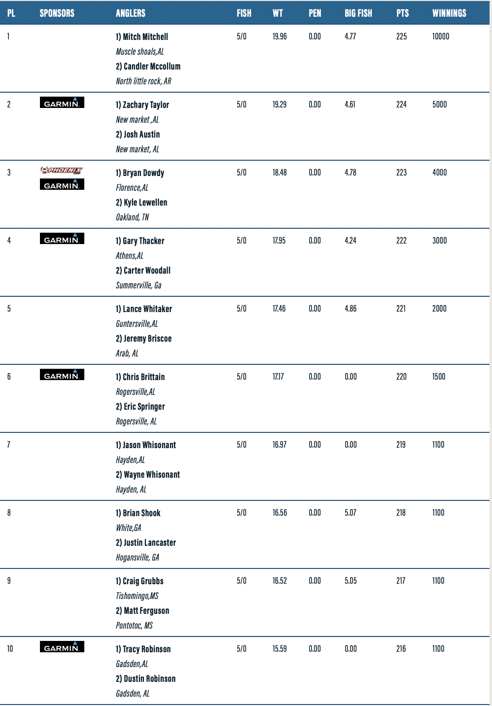 The Top 10 places are below for a complete list of standings visit: https://dev-alabama-bass-trail.pantheon.io/weiss-lake/results/